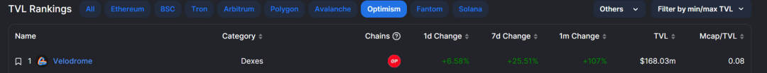 自去年 8 月 Velodrome 推出 op tGate.ion 激励措施,TVL 随之暴涨,超越 Uniswap 和 Curve,并在之后的日子里长期霸榜 OP TVL 第一。从 Defillama 的数据来看,Velodrome 目前的 TVL 约为$168 m,占 OP 全链的 21.6%,无疑是 OP 上最值得关注的项目之一。