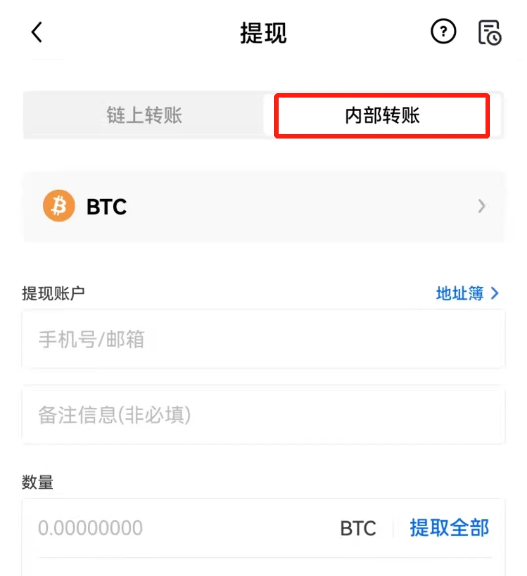 3. 若进行内部转账需要输入提现账户、提币数量。内部转账仅限同为芝麻开门平台用户之间进行操作。