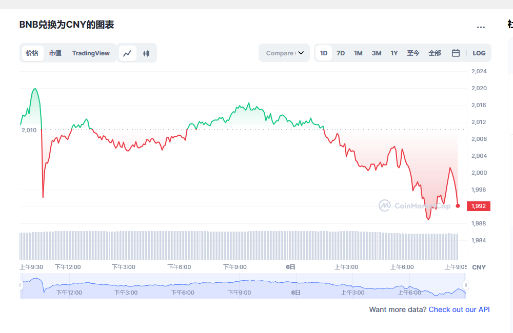 bnb价格今日行情价格为¥2,000.09元/枚。24H最高¥2019.1000,24H量326.98万,24H最低¥1.76.9500,24H额¥64.79亿,24H波幅+2.13%。