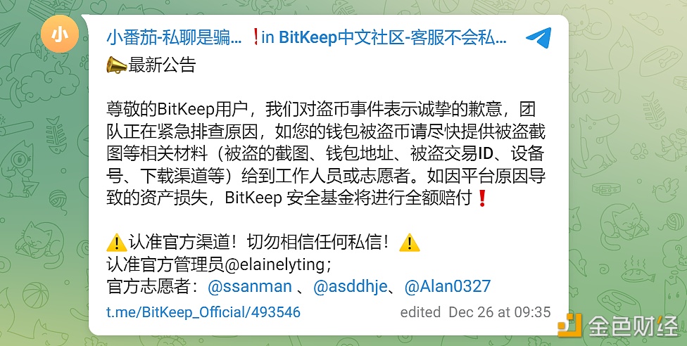 12月26日消息,针对多名用户反映的疑似盗币问题,多链钱包BitKeep在Telegram群组发布公告回应称,团队正在紧急排查原因,如钱包被盗币请尽快提供被盗截图等相关材料(被盗的截图、钱包地址、被盗交易ID、设备号、下载渠道等)给到工作人员或志愿者。 如因平台原因导致的资产损失,BitKeep安全基金将进行全额赔付。