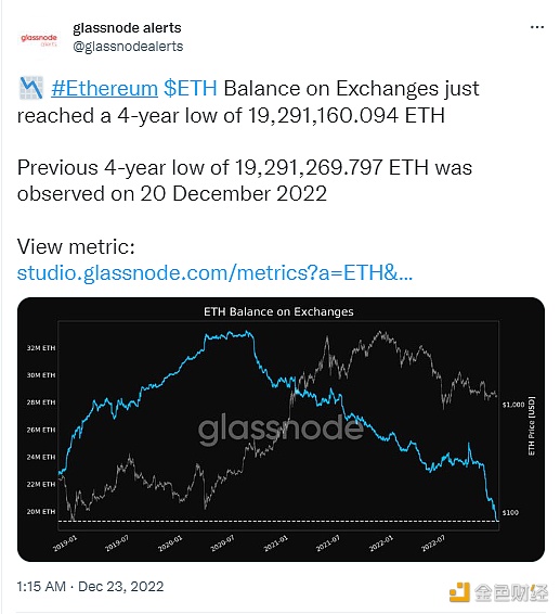 Glassnode数据显示,交易所的ETH余额刚刚达到19,291,160.094 ETH的4年低点,此前的4年低点为19,291,269.797 ETH。