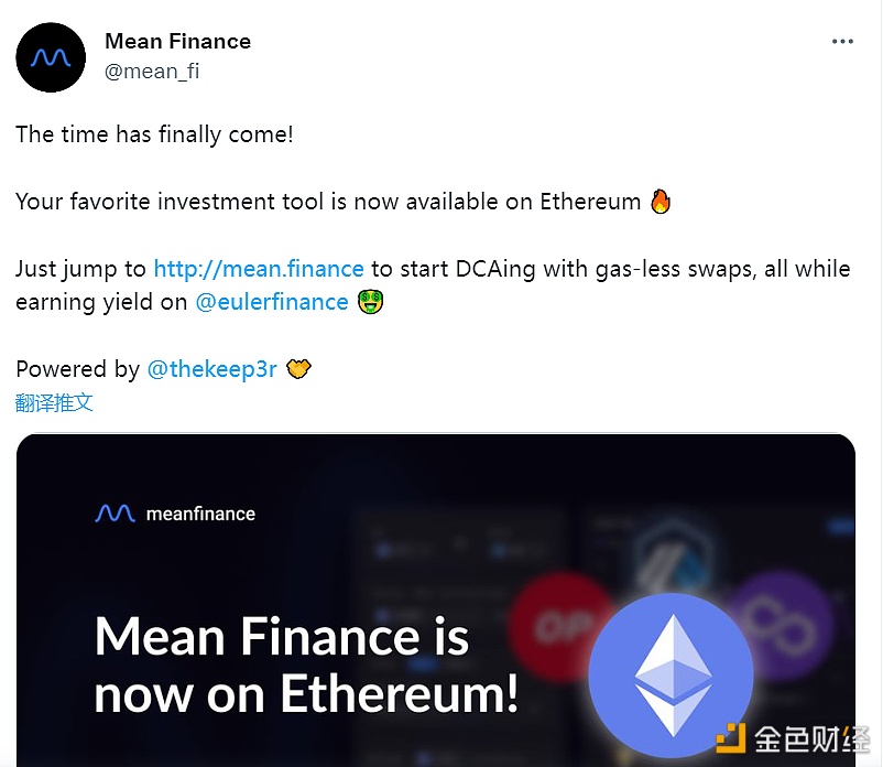 12月29日消息,基于美元成本平均法(DCA)的定投工具Mean Finance上线以太坊,用户可以选择固定时间买入支持的以太坊上资产并存储Euler Finance获取额外收益。