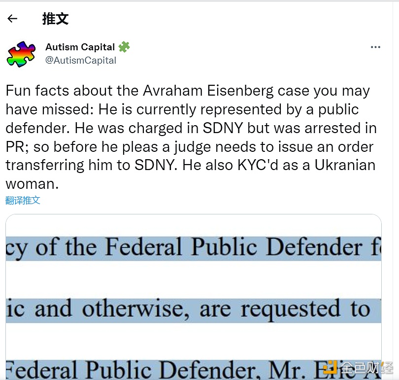 加密推特博主AutisCapital发推称,被逮捕的Mango攻击者Avraham Eisenberg目前由一名公设辩护律师(法庭指定律师)代理,他在纽约南区被提起指控,但在波多黎各被捕,所以在他认罪之前,法官需要发布命令将他转移到纽约南区,他还在KYC时冒充乌克兰女人。 此前报道,Avraham Eisenberg周一在波多黎各被捕,面临商品欺诈和商品操纵的指控,这些指控可能会受到罚款、监禁的惩罚。