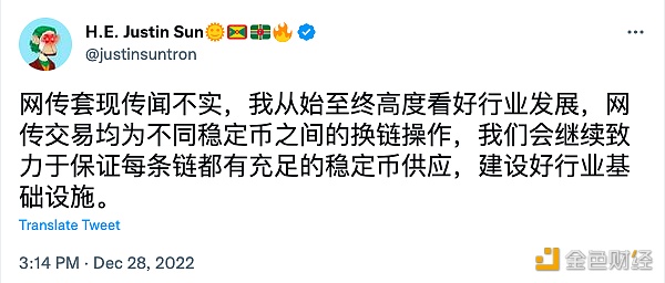 12月28日消息,针对0xScope发推称“从11月7日至今,孙宇晨疑似已套现超11亿美元”一事,孙宇晨于推特回应称,网传套现传闻不实,我从始至终高度看好行业发展,网传交易均为不同稳定币之间的换链操作,我们会继续致力于保证每条链都有充足的稳定币供应,建设好行业基础设施。 稍早前0xScope曾发推称,从11月7日至今,孙宇晨疑似已套现6.26亿枚USDC以及5.01亿枚BUSD,套现的路径多为将Tron上稳定币转入币安,然后再提出至以太坊并转入Paxos和Circle。