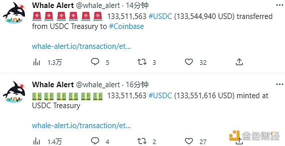 据Whale Alert数据显示,USDC Treasury铸造133,511,563枚USDC(价值约133,551,616美元)。随后将铸造的USDC全部转入了Coinbase。