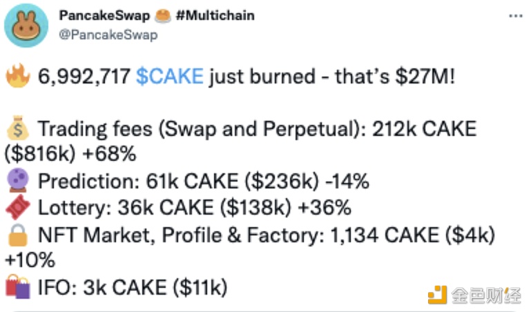 去中心化交易所PancakeSwap发推称,今日已经销毁6,992,717枚CAKE,价值约2700万美元。