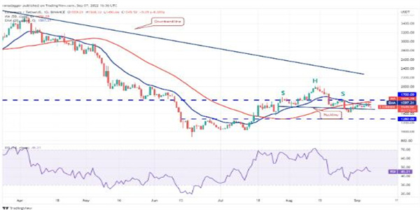 以太币(ETH)在 9 月 6 日升至移动平均线上方,但多头无法清除 1,700 美元的上方障碍。空头大举抛售,将价格拉回 20 天均线(1,597 美元)下方。