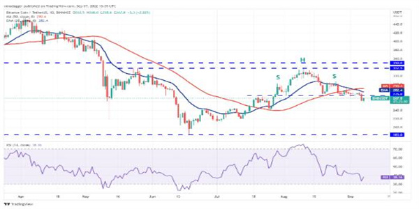 BNB 从 9 月 6 日的 20 日均线(282 美元)大幅下跌,并跌破关键支撑位 275 美元。这完成了看跌的 H&S 模式。