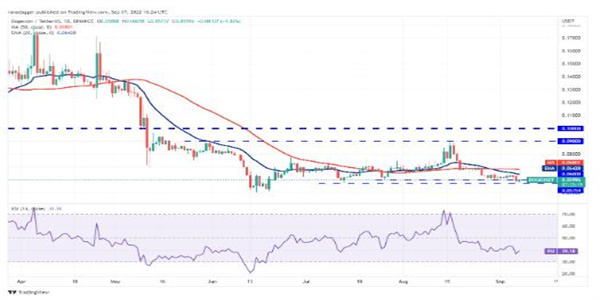 买家正试图在 9 月 7 日将价格推回 0.06 美元以上。如果他们成功,DOGE/USDT 对可能再次反弹至 20 日均线的上方阻力位。这仍然是短期内值得关注的关键水平,因为高于该水平的反弹可能会将价格推高至 0.07 美元。