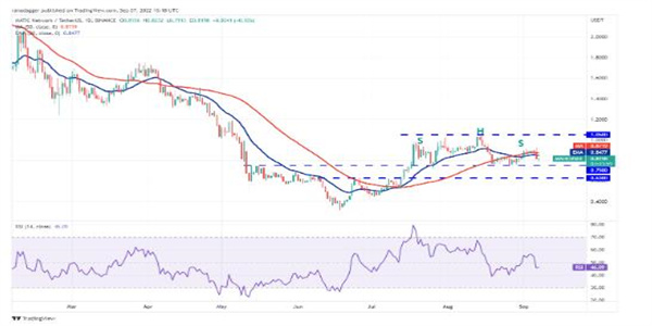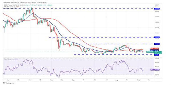 20 天均线(7.38 美元)正在向下倾斜,RSI 处于负值区域,表明对卖家有利。如果空头下跌并将价格维持在 6.79 美元的直接支撑位下方,则 DOT/USDT 货币对可能会跌至 6 美元的关键支撑位。多头可能会在这个水平上进行强有力的防御。