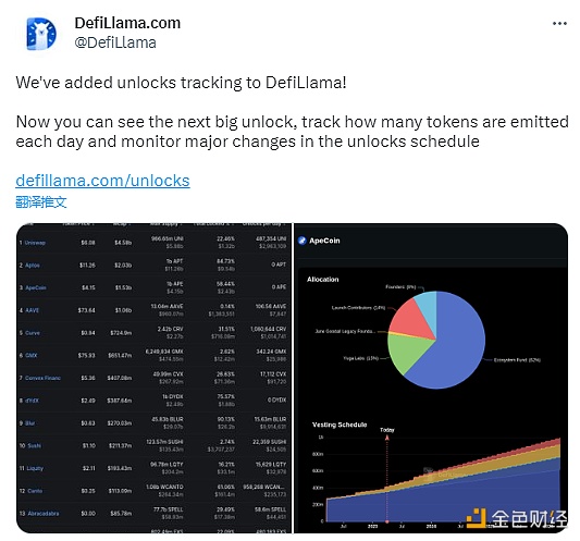链上数据分析网站Defi Llama宣布推出代币解锁追踪服务,允许用户查看未来会解锁代币的DeFi项目,以及每天释放的代币数量、监控代币解锁时间表。