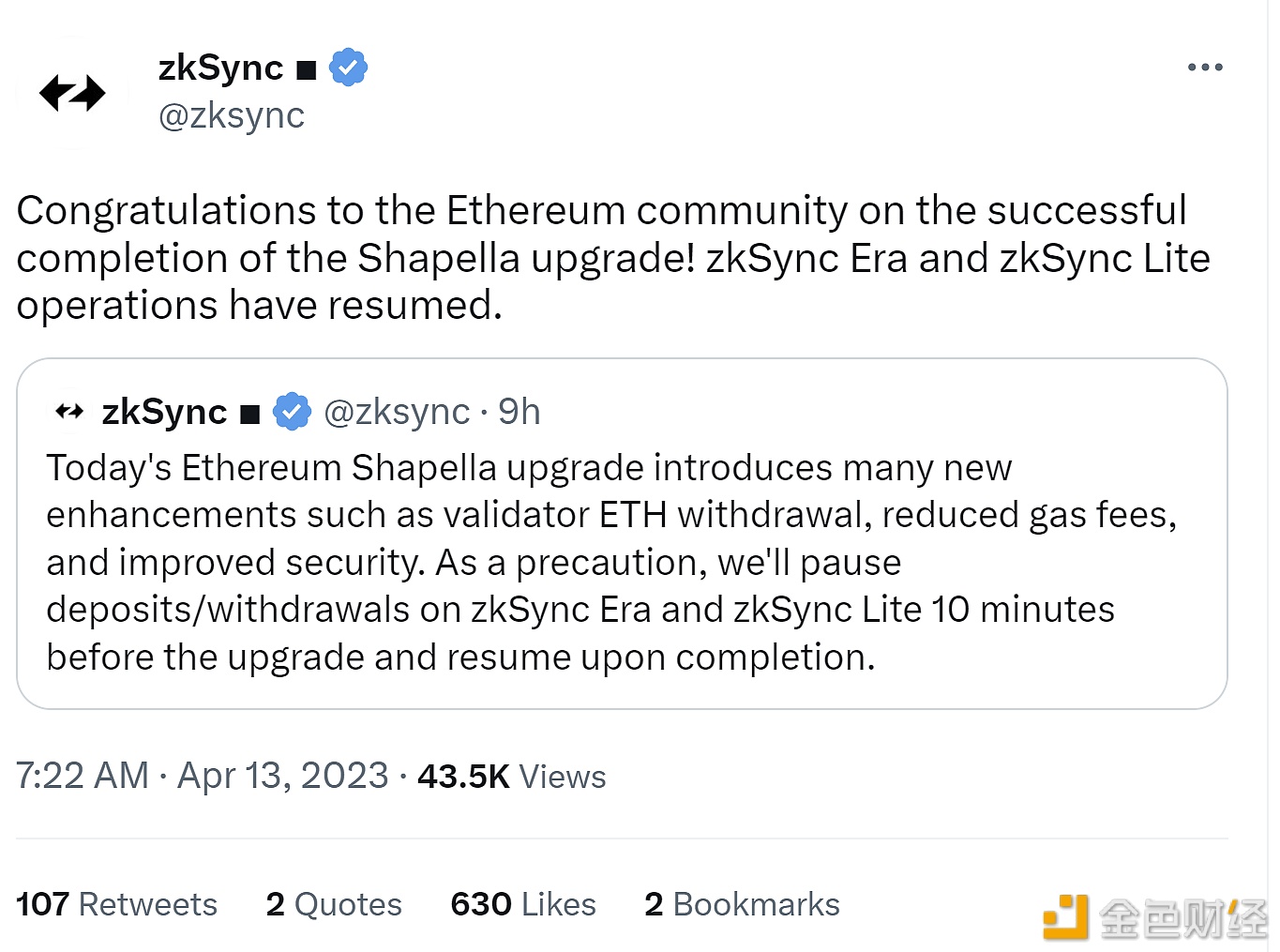 为配合以太坊Shapella升级,以太坊二层网络zkSync此前停止了zkSync Era和zkSync Lite存款/取款交易。 zkSync官推宣布,随着Shapella升级顺利完成,目前zkSync Era和zkSync Lite存款/取款等操作已经恢复。