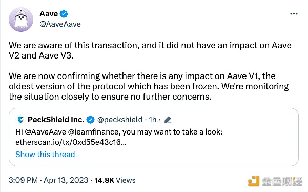 4月13日消息,Aave 在其社交平台表示,Yearn Finance 被盗事件对 Aave v2、v3 没有影响。而对于 Aave v1 的影响正在确认,该协议的最原始版本已被冻结。Aave 正在密切监视情况,以确保没有进一步的问题。 此前有社区反馈,此次 Yearn Finance 被盗事件是黑客通过 Aave v1 发起闪电贷攻击引发,派盾表示该事件的根本原因或是 yUSDT 的相关设置错误被黑客攻击。