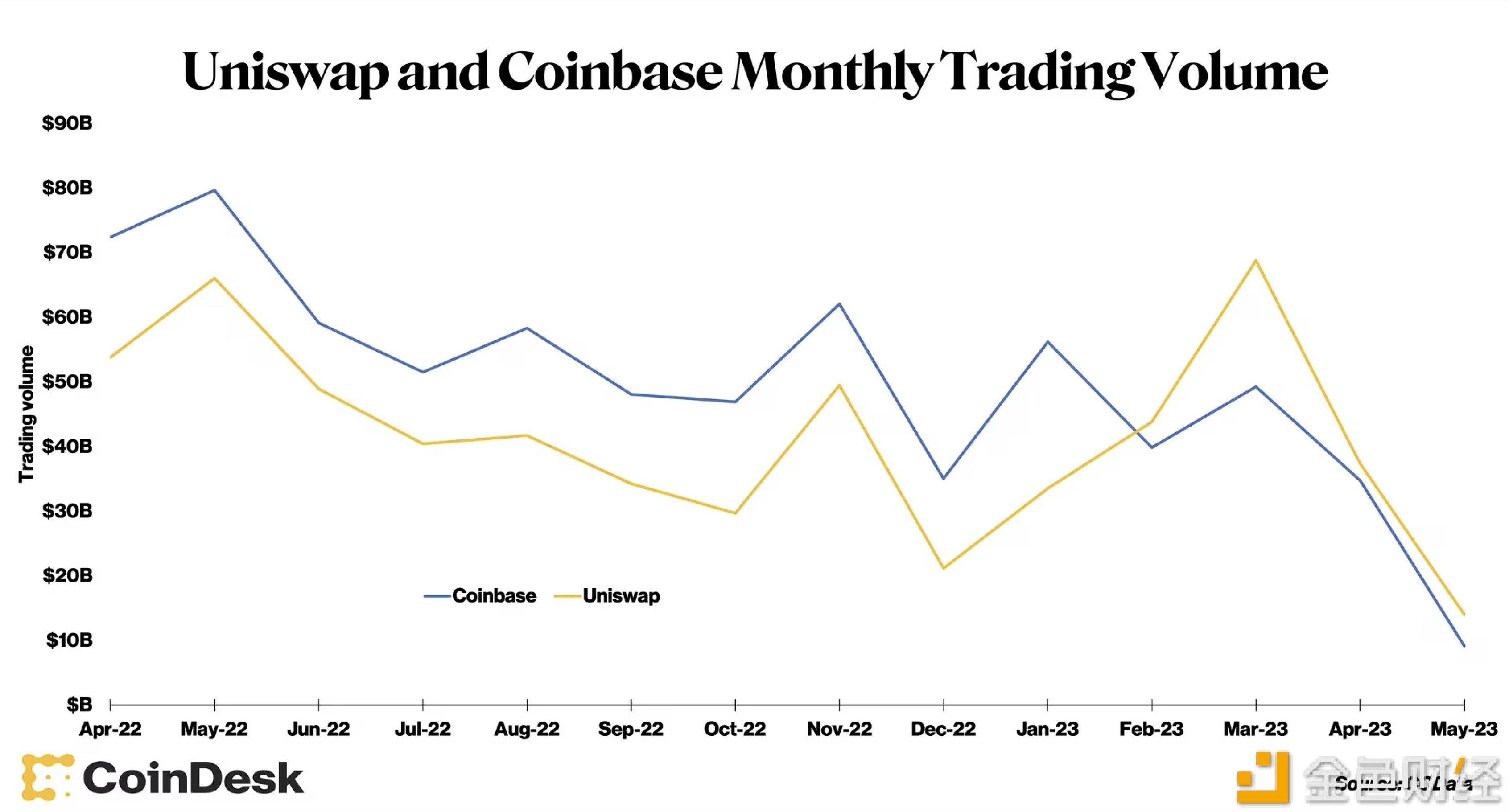 据CCData数据显示,去中心化交易所(DEX)Uniswap 4月份的交易量排名第一,连续第四个月超过Coinbase。Uniswap是运行在以太坊区块链上的DEX,交易量在2月份攀升至Coinbase之上,尽管此后两家交易所的交易量均有所下降,但Uniswap仍领先于Coinbase。Uniswap在4月份处理了约370亿美元的交易,而3月份处理了超过700亿美元的交易。Coinbase 4月份的交易量为340亿美元,而3月份为490亿美元。CCData研究分析师Jacob Joseph表示,3月份USDC与其他稳定币的脱钩是Uniswap交易量上升的一个重要因素。