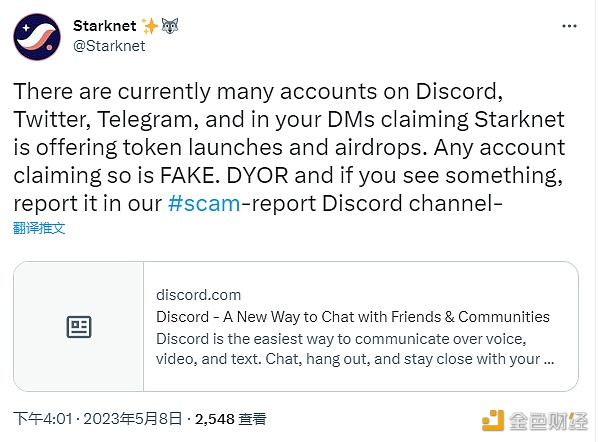 5月8日消息,Starknet官方在社交媒体上发文表示,目前有账户在Discord、Twitter、Telegram渠道,甚至向用户私信发送有关Starknet正在发布TGate.ion和空投的内容均为不实消息,任何发布该类信息的帐户都是不可信的。