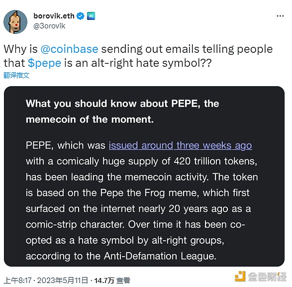 Coinbase发送给客户的电子邮件将memecoin Pepe(PEPE)描述为另类右翼团体的“仇恨符号”,这引起了memecoin社区的极大愤怒。著名的加密货币影响者Borovik.eth分享了5月10日给他的96,000名粉丝的电子邮件通讯截图,其中引用了反诽谤联盟2016年的一项决定,将青蛙主题的角色放入其在线仇恨符号数据库中。