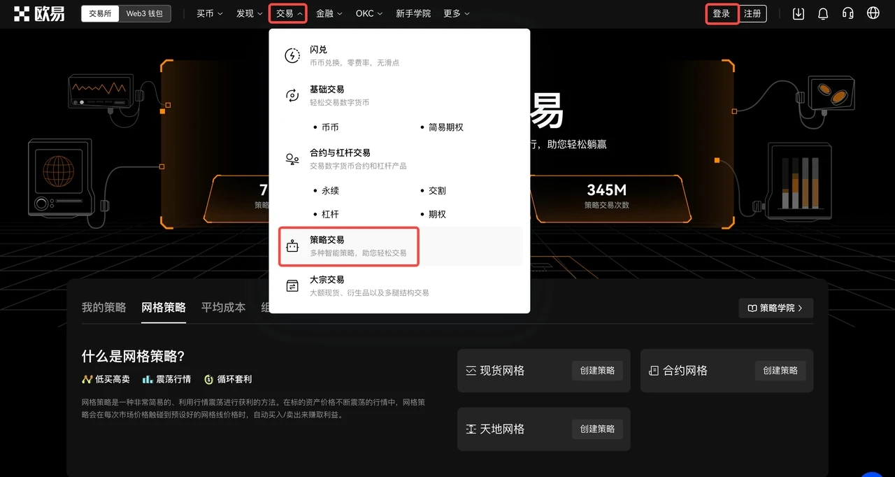 登录官网,点击【交易】-【策略交易】,进入策略广场。