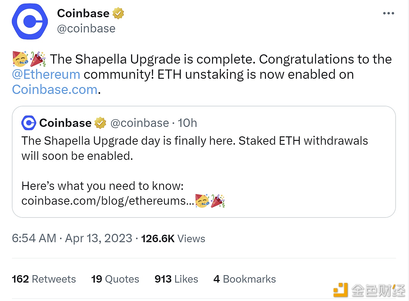 据官方推特,Coinbase宣布已启用ETH解除质押功能。 此前消息,以太坊上海升级已完成。