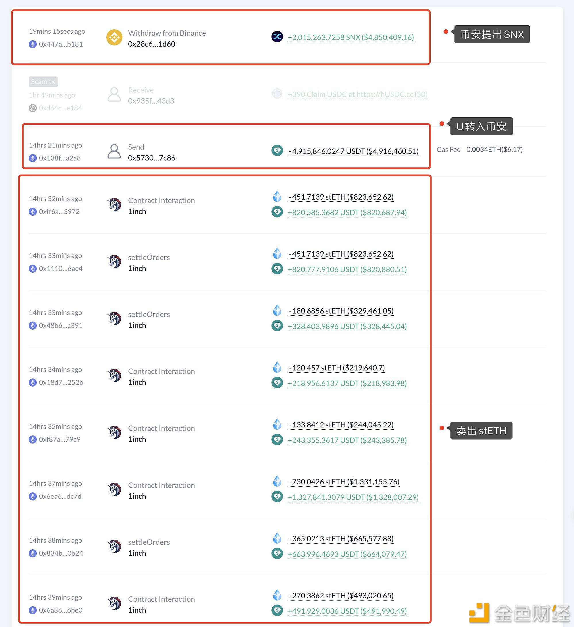 据推特用户余烬表示,今日SNX的上涨是因为鲸鱼的买入,今天凌晨2:30通过1inch出售2703stETH获得491万USDT;2:48将491万USDT转入Binance;3:03开始,几笔大单买入将SNX价格由$2.25拉升至$2.5;16:50他从Binance提出201万SNX($4.85M)。