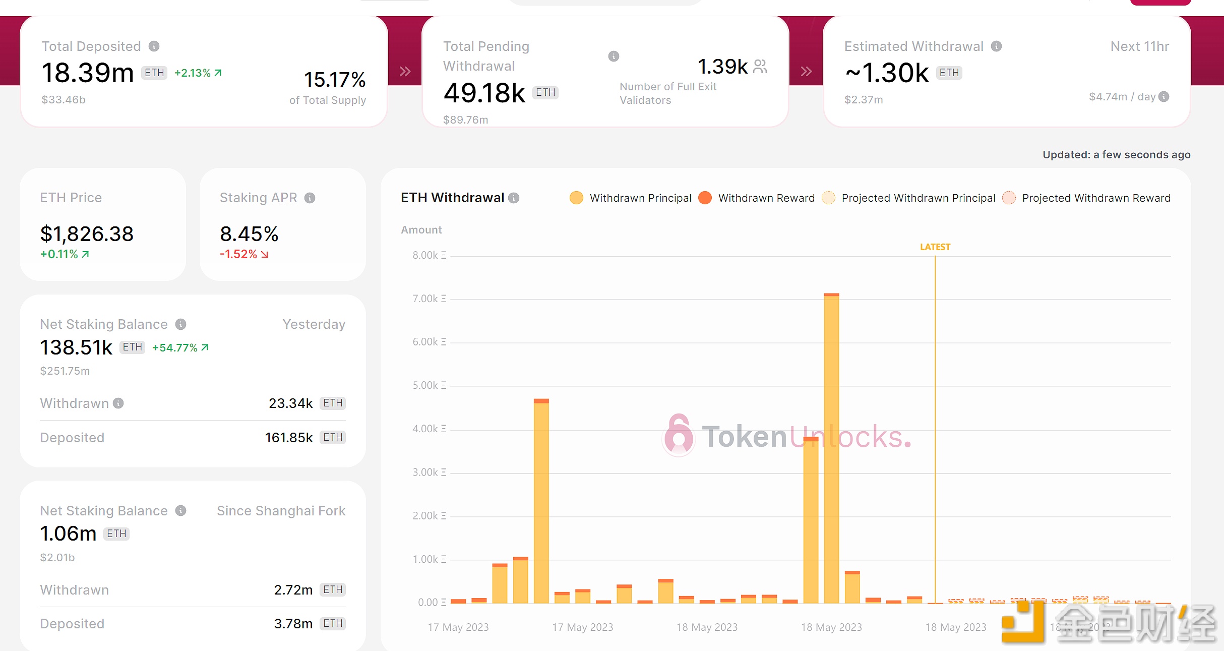 TGate.ion.Unlock数据显示,自4月13日以太坊主网完成上海升级以来,已有约272万枚ETH解除质押,约378万枚ETH新存入质押,总质押量净增长约106万枚ETH。此外,当前约4.9万枚ETH处于待提款状态。