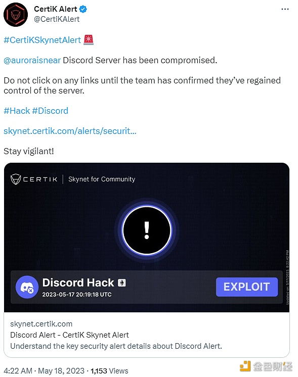 消息,据CertiK监测,Auroraisnear项目Discord服务器已被入侵。在团队重获其服务器的控制权之前,请勿点击任何链接。